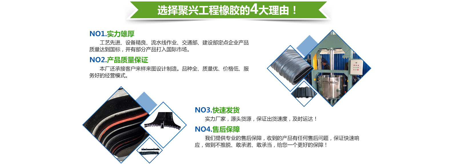 衡水聚興工程橡膠有限公司,位于河北省衡水市榕花街,石德高速,石德鐵路,京九鐵路在此交匯,106國道,石黃高速由境內(nèi)穿過。得天獨(dú)厚的地理位置為公司的發(fā)展創(chuàng)造了良好的交通條件。本廠工藝先進(jìn)、設(shè)備精良、流水線作業(yè)、交通部、建設(shè)部定點(diǎn)企業(yè)產(chǎn)品質(zhì)量達(dá)到國標(biāo),并有部分產(chǎn)品打入國際市場(chǎng)、我廠主要生產(chǎn)止水帶、橋梁支座、輸送帶、伸縮縫、托滾高壓膠管,并按圖加工各種橡膠制品。同時(shí)本廠還承接客戶 ...